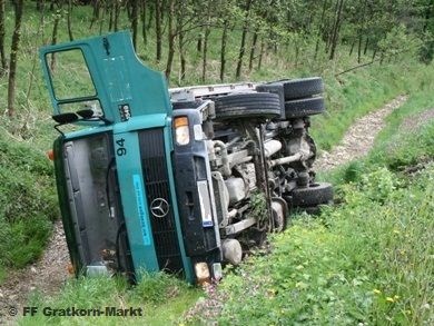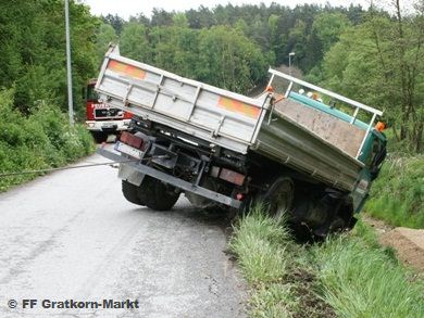| Ein LKW Fahrer kam durch ein Ausweichmanöver zu weit auf das Bankett hinaus und stürzte seitlich in den Dultbach. Für die Bergung wurde zuerst der LKW mit der Seilwinde des RLF auf die Räder gestellt und gesichert. Anschließend wurde er mittels Seilwinde des SRF aus dem Graben gezogen und nach der Bergung mit Hilfe der Abschleppstange zu einer Ausweichstelle gezogen. Von uns wurden noch geringe Mengen an kontaminiertem Erdreich abgetragen und entsorgt. | |||||||||||