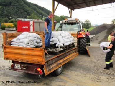Aufgrund der starken Niederschläge in weiten Teilen der Steiermark musste auch die Freiwillige Feuerwehr Gratkorn-Markt zu mehreren Hochwassereinsätzen im Bereich der Mur ausfahren. Begonnen hat die Einsatzserie mit einer Alarmierung des Schweren Rüstfahrzeuges zum Lösen einer Verklausung bei der Firma Hamburger Frohnleiten. Während das SRF mit 3 Mann zum Einsatz nach Frohnleiten ausrückte, wurde von HBI Thomas GLANNER die Mur im Bereich Eggenfeld kontrolliert. Da sich auch dort die Lage zuspitzte wurde von ihm eine erneute Alarmierung der Feuerwehr um 16:17 veranlasst. Die nun im Rüsthaus befindliche Mannschaft wurde auf die Fahrzeuge aufgeteilt und eine Lageführung im Rüsthaus aufgebaut. Auch wurde Bürgermeister Ernest Kupfer verständigt und über die aktuelle Lage informiert. Dieser machte sich dann auch persönlich ein Bild über die Situation. |