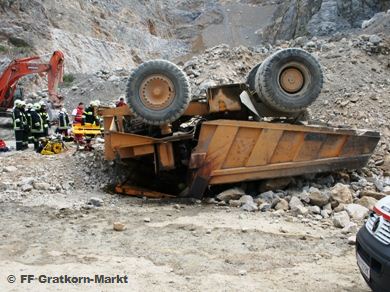 | Am 16.08.2012 wurden wir um 12:01 zum Kanzelsteinbruch in Gratkorn mit dem Stichwort "Person unter Muldenkipper eingeklemmt" alarmiert. Sofort nach der Alarmierung setzten wir uns mit dem RLF-A 2000 und dem SRF zum Einsatzort in Bewegung, wo wir gleichzeitig mit dem Notarzthubschrauber ankamen. Einsatzleiter HBM TRINKL Alfred erkundete als Erster die Lage, während die restliche Mannschaft alles für eine technische Menschenrettung mit schweren Gerät vorbereitete. Leider konnte der anwesende Notarzt nur mehr den Tod des Fahrers feststellen. Unsere Aufgaben am Einsatzort beschränkten sich auf die Personenbergung mittels Hydraulischen Rettungsgerät und das Binden von ausgelaufenen Betriebsmitteln. | |||||||||||