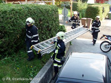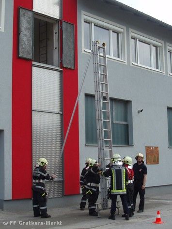 | „Zur Brandbekämpfung im 2. OG mittels HD-Rohr, über Schiebleiter – vor!“ Das rasche Aufstellen der 3-teiligen Schiebeleiter erfordert neben dem regelmäßigen Training auch Muskelkraft. |